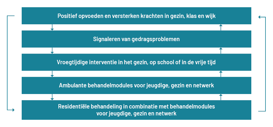 Het voorkomen van opvoed- en ontwikkelproblemen start met een sterke pedagogische basis in gezin, klas en wijk. Signalering en vroegtijdige interventie zijn gericht op het tijdig en kort ondersteunen van gezin en omgeving. De pijlen aan de zijkanten van de figuur laten zien dat jeugdhulp direct kan worden bijgeschakeld door een gemandateerde verwijzer, maar ook dat er altijd weer wordt teruggeschakeld naar de basisvoorzieningen. Daarnaast is in het model de consultatiefunctie opgenomen voor overdracht van specifieke kennis aan de basisvoorzieningen.